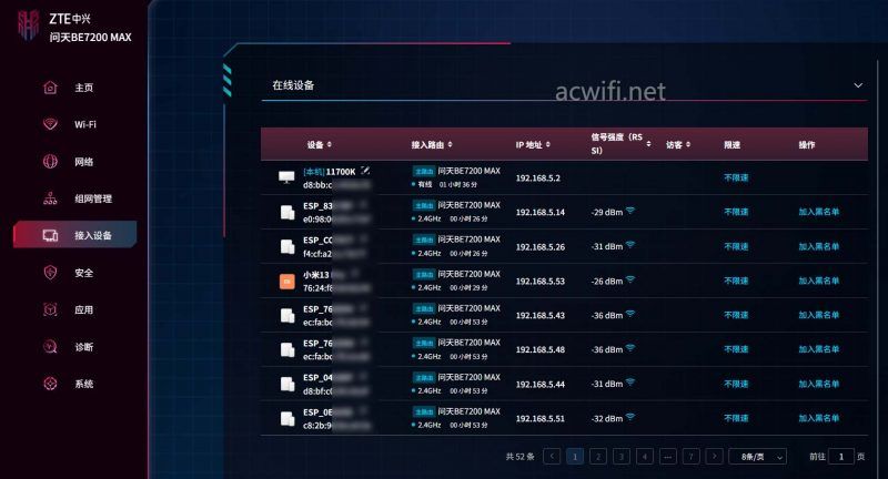 实测同时通电50个智能插座后,20秒左右就能全部连接上。(下图显示接入设备52台,其中一台电脑一台手机。)