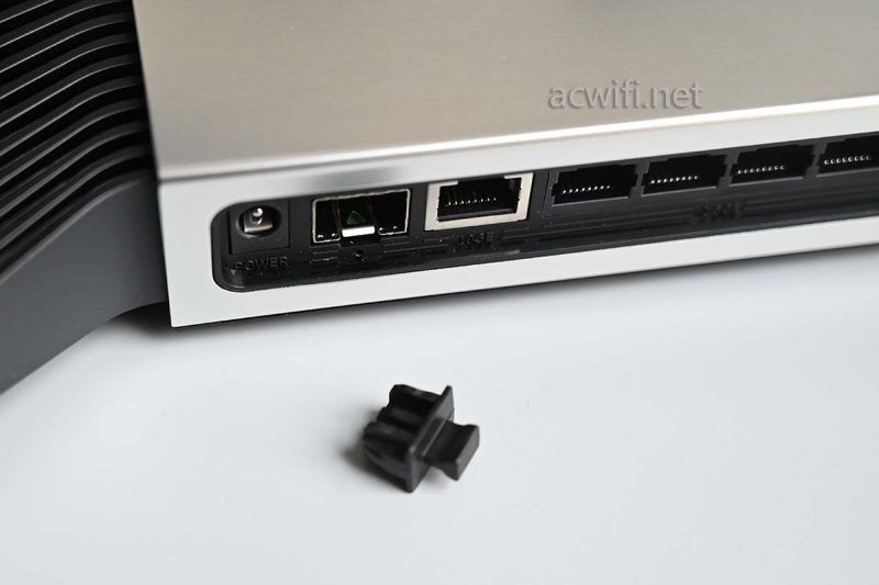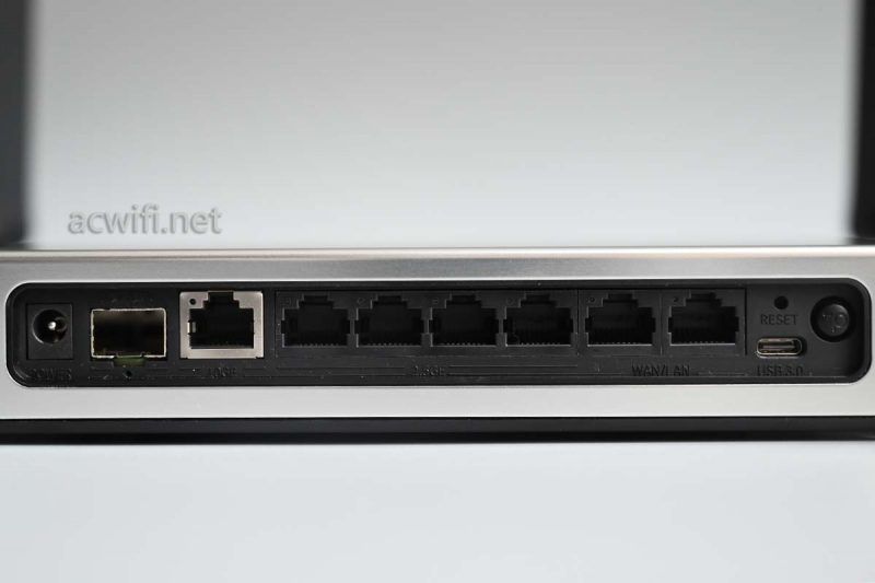 该路由器采用黑银配色,外置 9 颗独立 FEM,提供 1 个 10G SFP+ 口、1 个 10G 网口、4 个 2.5G 网口、2 个千兆网口以及 1 个 USB-C 3.0 接口。