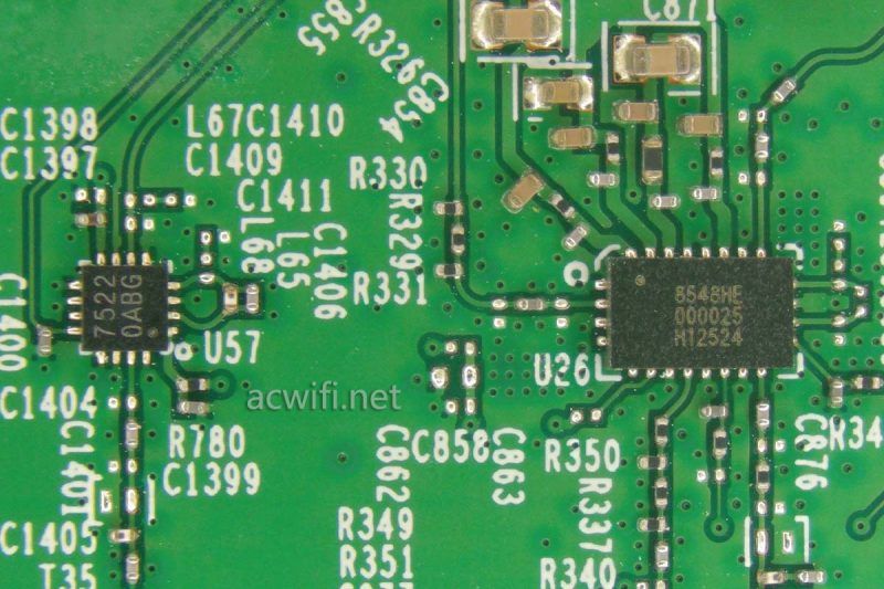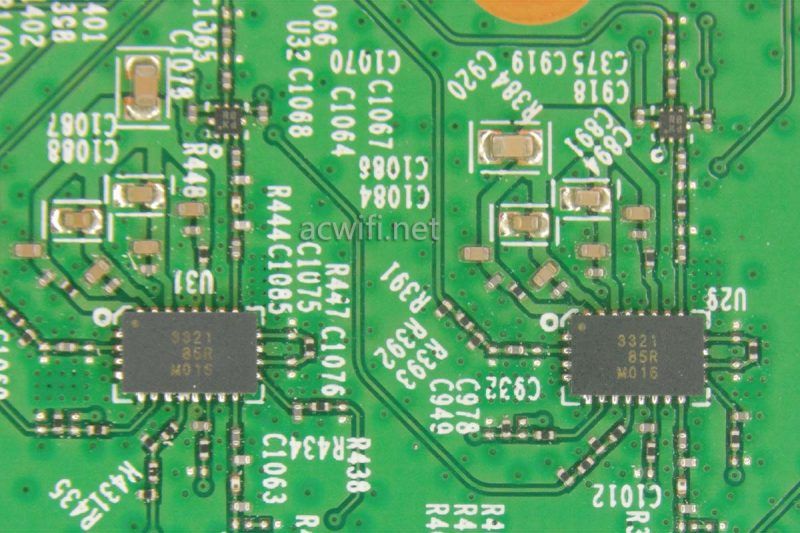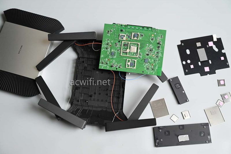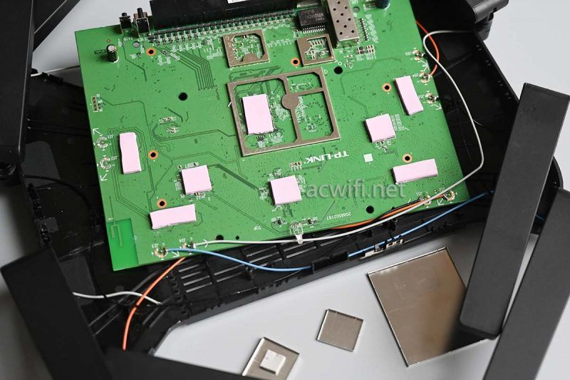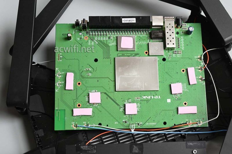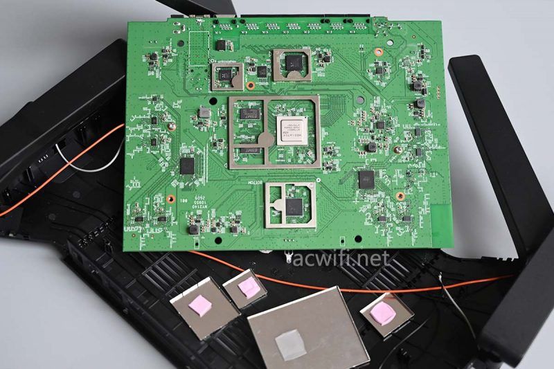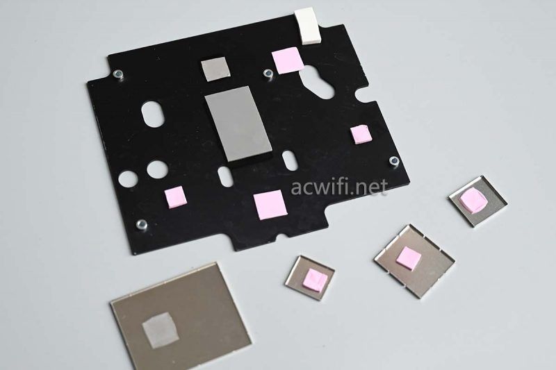翻回主板另一面,也就是刚打开外壳时看见的有2个一大一小散热片的那一面。把两片散热器拿走之后的样子。有许多导热硅脂垫片,帮助把无线芯片、交换芯片、FEM芯片的热量导向散热器。