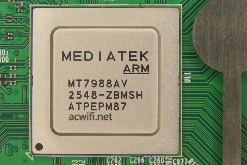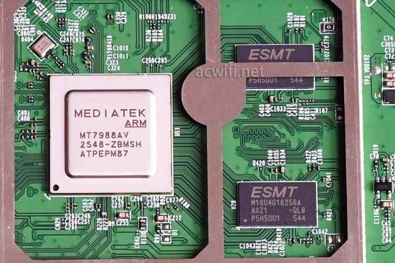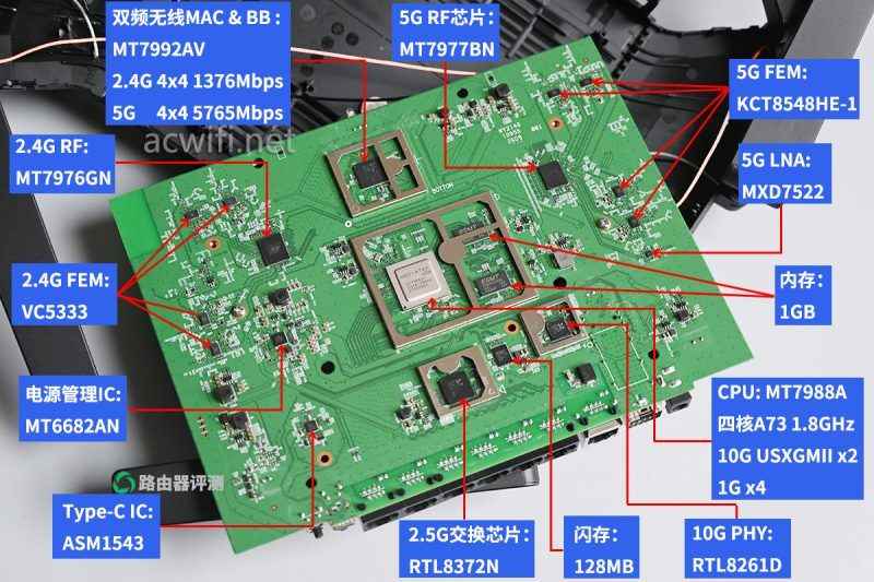 与MT7988A相连的无线基带和无线MAC芯是MT7992A,2.4G和5G均支持4×4 MIMO,无线速率分别为1376Mbps、5765Mbps。