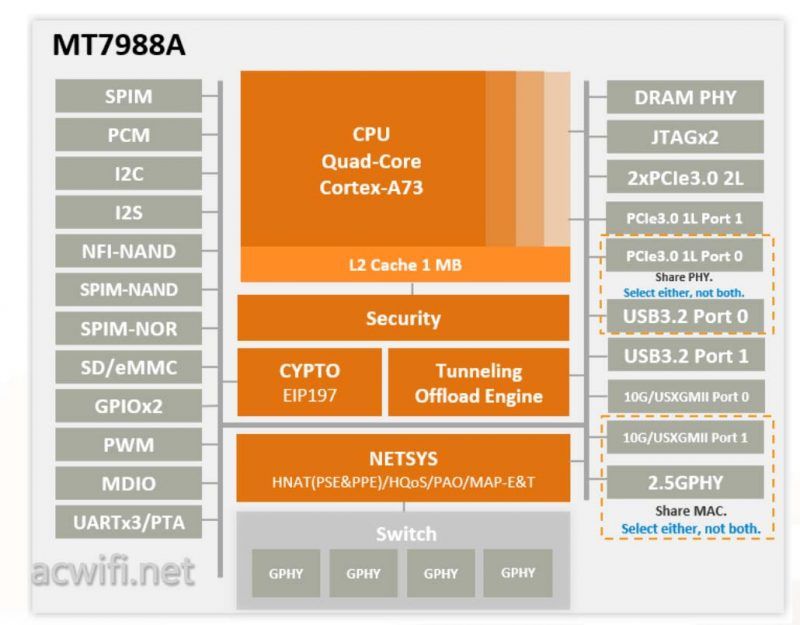 首先是主板中间显眼的CPU,型号是联发科的MT7988AV(简称MT7988A),四核A73最频率1.8GHz,12nm制程。有两个USXGMII,其中一个与2.5G PHY共享MAC,支持USB3.2,内置四口千兆交换芯片。