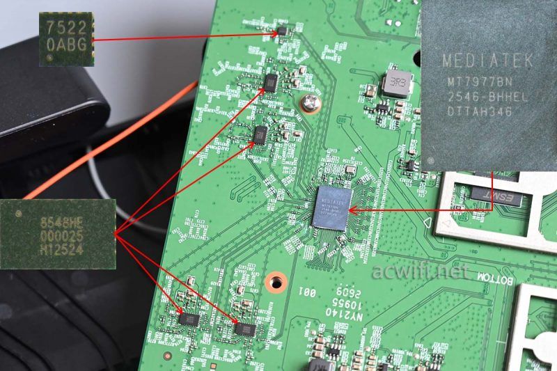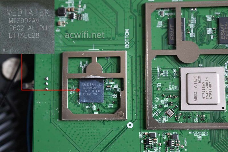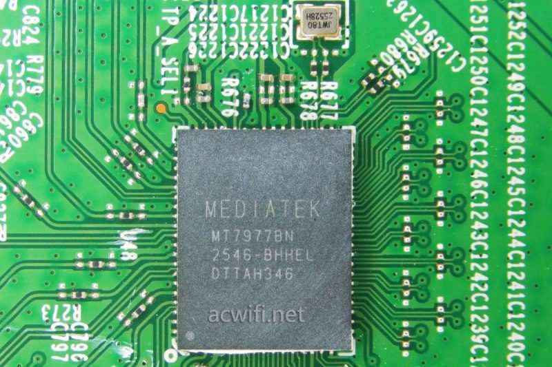 然后是5G RF芯片,型号是MT7977BN,这是没有内置5G FEM的版本,需要用到外置独立的FEM,支持4T5R。