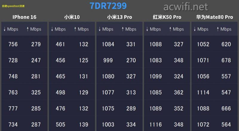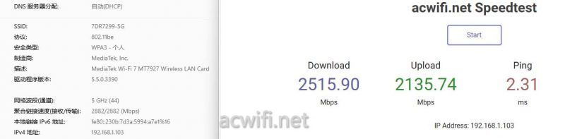 随手拿MT7927无线网卡连接7DR7299的5G,测速如下:
