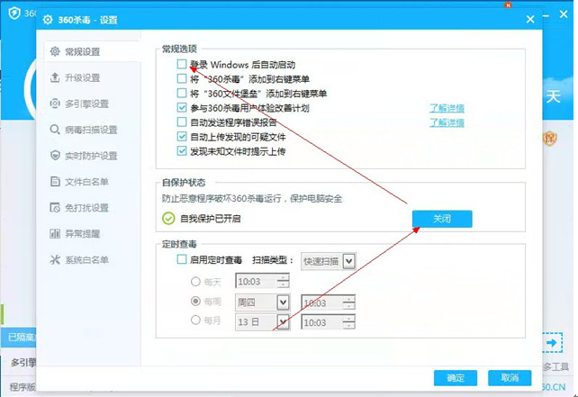 另外,这次新版升级之后,有部分用户在开启过程中会提示遇到错误,可以尝试以下操作:打开360杀毒的设置页面,取消登陆Windows后自动启动,关闭自我保护。