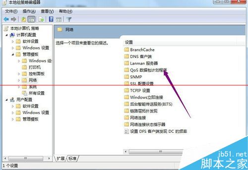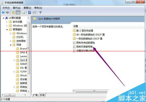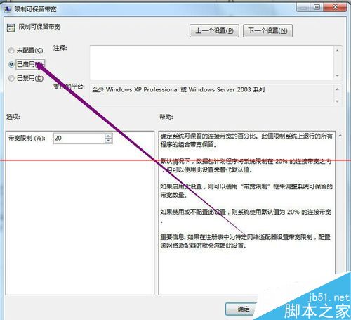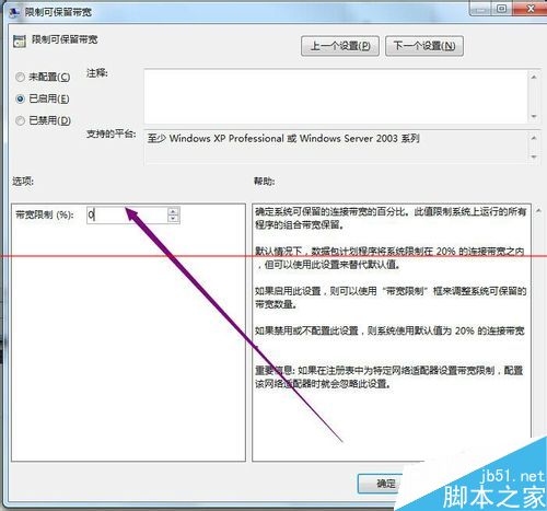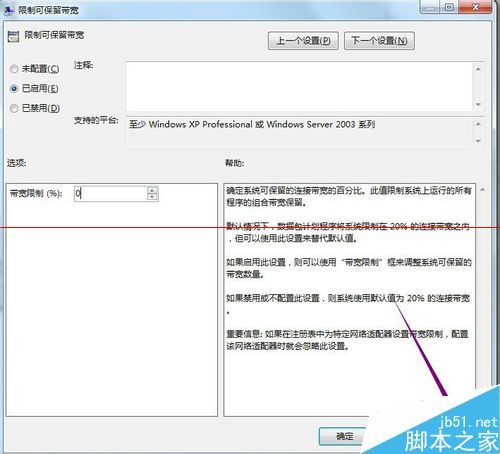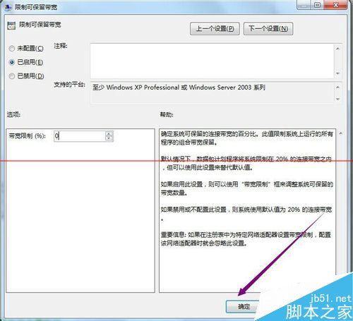 10、在打开的属性对话框中的“设置"选项卡中将”限制可保留带宽“设置为”已启用“,然后在下面展开的”带宽限制(%)“栏将带宽值”20“设置为”0“即可