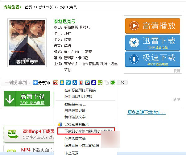第三步:插件安装完成后,在插件菜单中便可以看到”一键下载到小米路由器“这个功能图标了。接下来我们就可以去网上找到一些需要下载的电影或者文档了,在找到的资源下载链接处,我们单击鼠标右键,然后选择“下载到小米路由器”,就可以了。