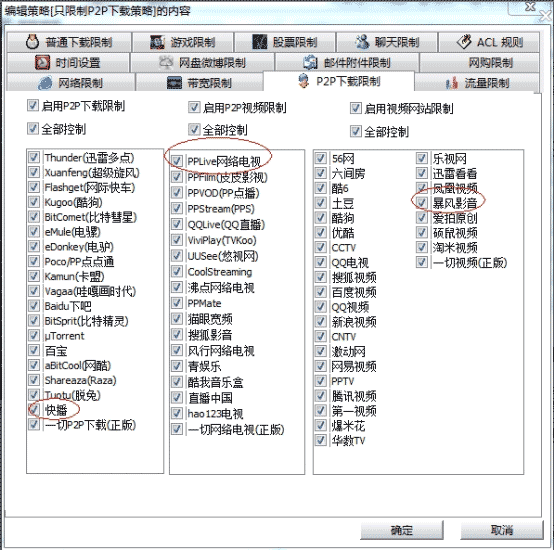同时,聚生网管集成了强大的对局域网P2P软件下载(尤其是国内唯一可以完全禁止迅雷下载)、限制PPS影音、禁止PPlive、屏蔽PPTV、禁止QQ直播等P2P软件的功能,并且还可以有效禁止QQ游戏、禁止炒股、禁止聊天、限制网购等诸多网络管理功能。如下图所示: