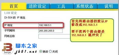 一、从路由器A的LAN口分下的线插在路由器B的WAN口,对路由器B进行设置,将路由器B的默认网关地址修改下192.168.5.1,因为如果两个都是192.168.0.1肯定会冲突。