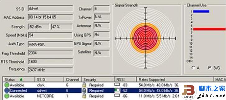 在中间右边区域看到当前环境下周边的无线网络信号基本情况,这里主要显示的是无线信道相关信息,包括有几个2信道,有几个6信道等等,下面还有个切换按钮可以在802.11a与802.11b/g模式之间更换,估计绝大多数人用的无线网络都是b/g的,不过不知道为什么没有未来的趋势802.11n切换。