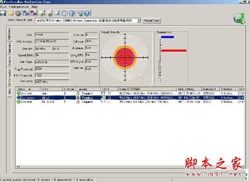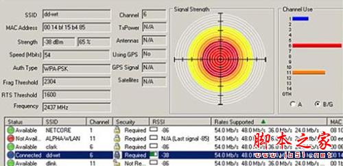 在中间右边区域看到当前环境下周边的无线网络信号基本情况,这里主要显示的是无线信道相关信息,包括有几个2信道,有几个6信道等等,下面还有个切换按钮可以在802.11a与802.11b/g模式之间更换,估计绝大多数人用的无线网络都是b/g的,不过不知道为什么没有未来的趋势802.11n切换。