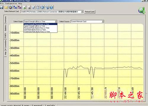 除了上面提到的无线信号扫描功能外,wirelessmon还提供了信号强度检测、监测无线网络的传输速度与图标生成等功能,点主界面左侧的graphs,横坐标是时间坐标,而纵坐标可以由我们来选择参数,包括signal strength percentage,signal strength(DBM),received rate,sent rate,total data rate等等,以便让我们了解网络的下载速度或其稳定性。