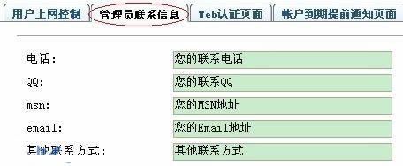 选择管理员联系信息选项,可以自定义管理员的联系信息,以方便用户在网络出现问题时方便联系管理员,此信息在用户登陆后可以查看到,PPPOE用户在拨号以后需要登陆IE才能看到。