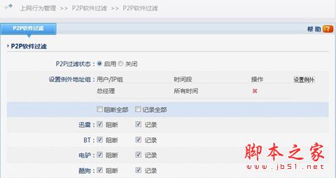 点击启用聊天软件过滤状态,可以选择阻断全部或者单个进行选择,还可以对各软件的行为进行记录;点击“设置例外”,添加例外“用户/IP组”以使例外组不在阻断范围之内,如图添加总经理在所有时间不被阻断,而产品管理部在上班时间不被阻断,下班时间就会被阻断。
