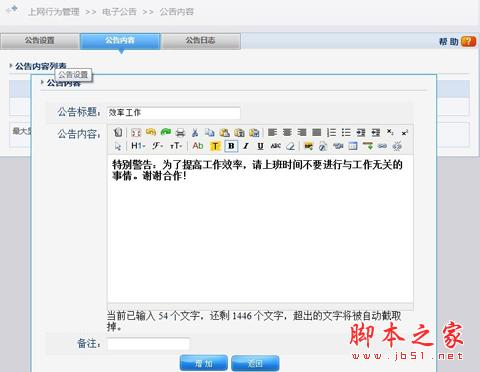 在“公告内容”处增加一段电子公告,如图增加题目为“效率工作”的公告,