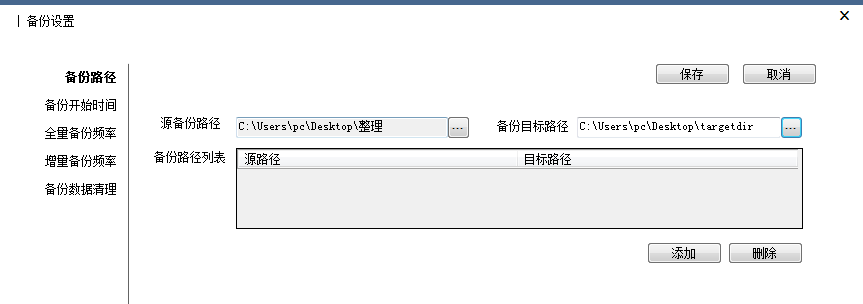 点击“新增配置”按钮,首先设置备份路径,选择源备份路径和备份目标路径,并点击“添加”。如下图: