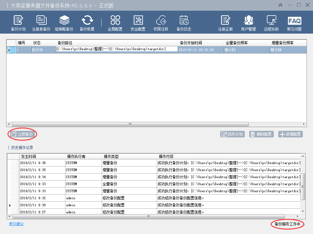 全部设置完成后,点击“保存”按钮,方可真正生效。而且每次修改了备份信息都需要点击“保存”才能生效。保存成功后,系统就开始了自动备份,每次执行备份后都会输出日志,并且日志还会保存到程序所在的安装路径下面,便于事后备查和审计。软件右下角会显示程序工作状态。如果想要立即执行备份,可点击“立即备份”按钮。如下图: