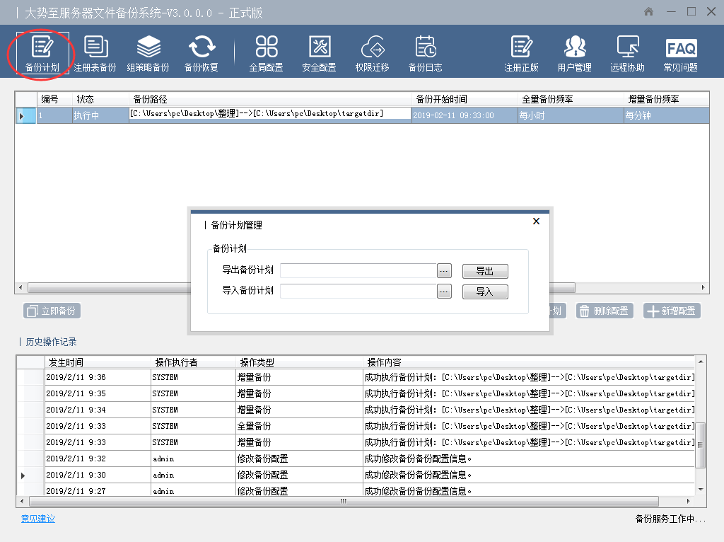 为了防止备份计划丢失,备份计划支持导出和导入。首先选择导出路径,然后点击“导出”按钮,即可将备份计划导出,需要导入时,先选择之前导出的备份计划文件,然后点击“导入”按钮即可。如下图: