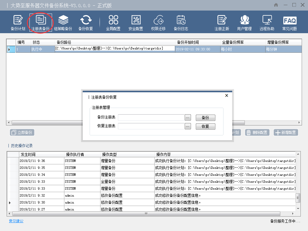 为防止注册表被修改或删除,可通过此功能备份和恢复注册表。首先选择备份路径,然后点击“备份”按钮,即可将注册表备份出来。需要恢复注册表时,先选择之前的备份文件,然后点击“恢复”按钮,即可恢复注册表。如下图: