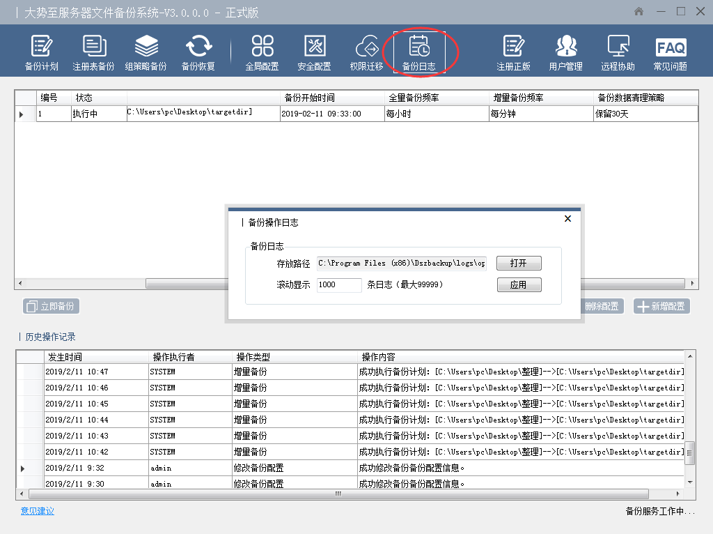 “备份日志”是指本系统备份日志的存储路径。默认存储在软件的安装目录下面C:\Program Files\Dszbackup\logs\oprs\,点击后面的“打开”便可以看到日志文件。同时,这里还可以设置在软件主界面上滚动显示的日志条数,设置之后需要点击“应用”方可生效。如下图: