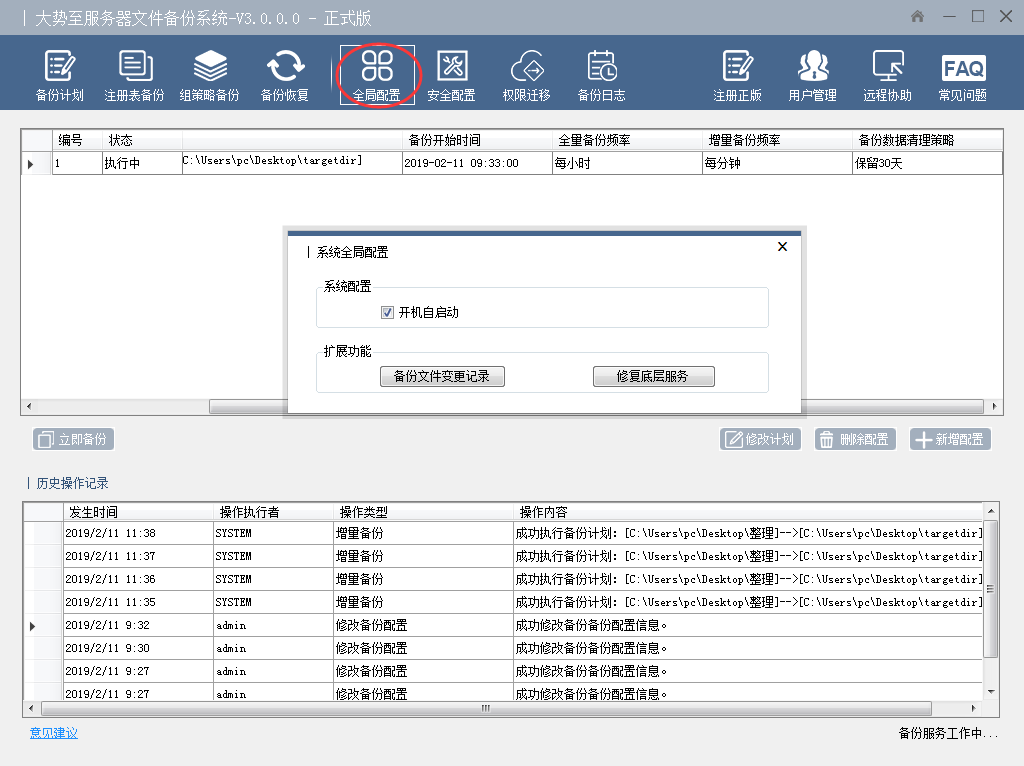 这里可设置软件开机自启动,“备份文件变更记录”,此功能会记录备份源文件夹内文件变动情况,便于管理员查询;“修复底层服务”,本功能是自动卸载本系统之前的底层服务,然后自动重新安装服务,便于系统正常工作。