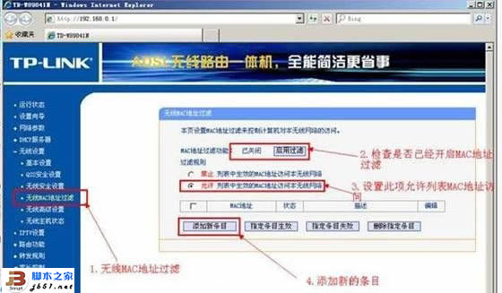 三、只允许以下设置的MAC网卡地址才能登录,其他无线电脑是无法使用本无线路由器访问网络的。选择完之后单击添加新条目。进行添加新的MAC网卡地址设置。