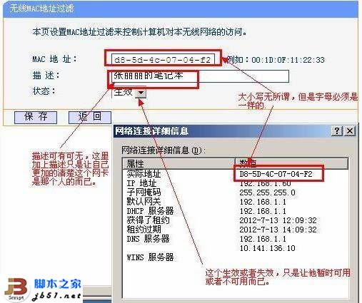 四、单击添加新条目之后,弹出如下图所示的新网页,在这个网页里添加新的电脑,这个MAC地址,就是需要联网的无线网卡的MAC地址。描述可有可无,描述只是让自己知道这个MAC地址是谁的,只是方便管理而已。状态就设置成生效就行,如果失效的话,此人的无线连接就无法连上无线路由上网了。设置完成之后直接保存即可生效。