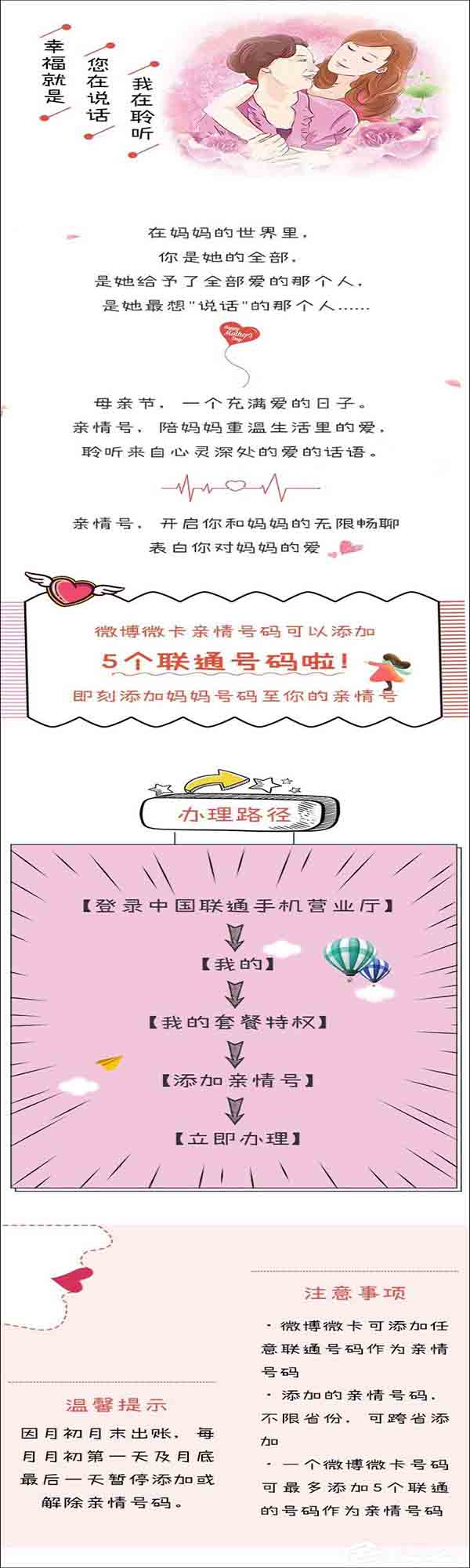 据悉,自今年3月正式推出亲情号功能后,微博微卡的亲情号功能在5月13日(母亲节)又有了新的升级,其原有的3个亲情号数量增加至5个。