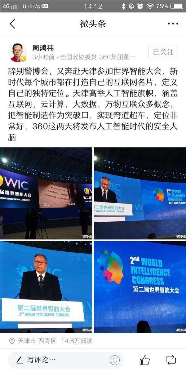 今天下午,周鸿祎在个人头条号表示“辞别警博会,又奔赴天津参加世界智能大会,新时代每个城市都在打造自己的互联网名片,定义自己的独特定位。天津高举人工智能旗帜,涵盖互联网,云计算,大数据,万物互联众多概念,把智能制造作为突破口,实现弯道超车,定位非常好,360这两天将发布人工智能时代的安全大脑。”