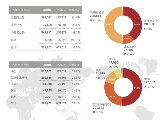消费者业务首次取代运营商业务成为华为第一大营收支柱,2018年营收为3489元,同比增长45.1%,占总营收48.4%。