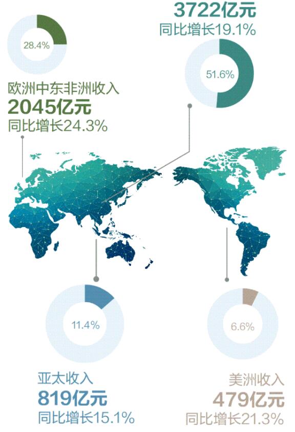 按国家和地区来算,中国市场营收3722亿元,占比51.6%,增长19.1%,欧洲中东非洲地区营收2045亿,占比28.4%,接下来是亚太及美洲地区,营收分别是819、479亿元。