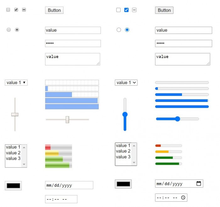 Chrome 和 Edge 进行了合作,以改善 HTML 表单控件的外观和功能。下图显示了 Chrome 中某些控件的新旧版本对比(左旧右新)。