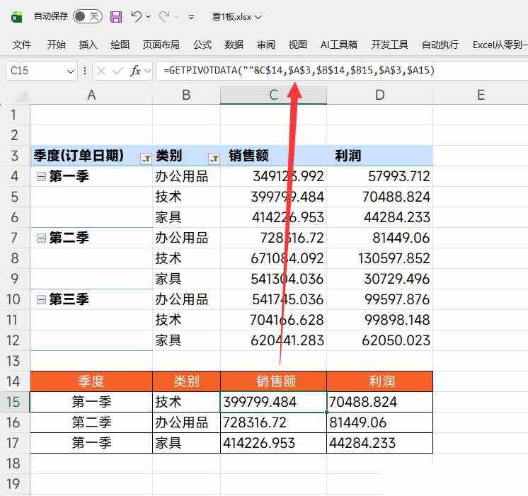 公式:=GETPIVOTDATA(""&C$14,$A$3,$B$14,$B15,$A$3,$A15)