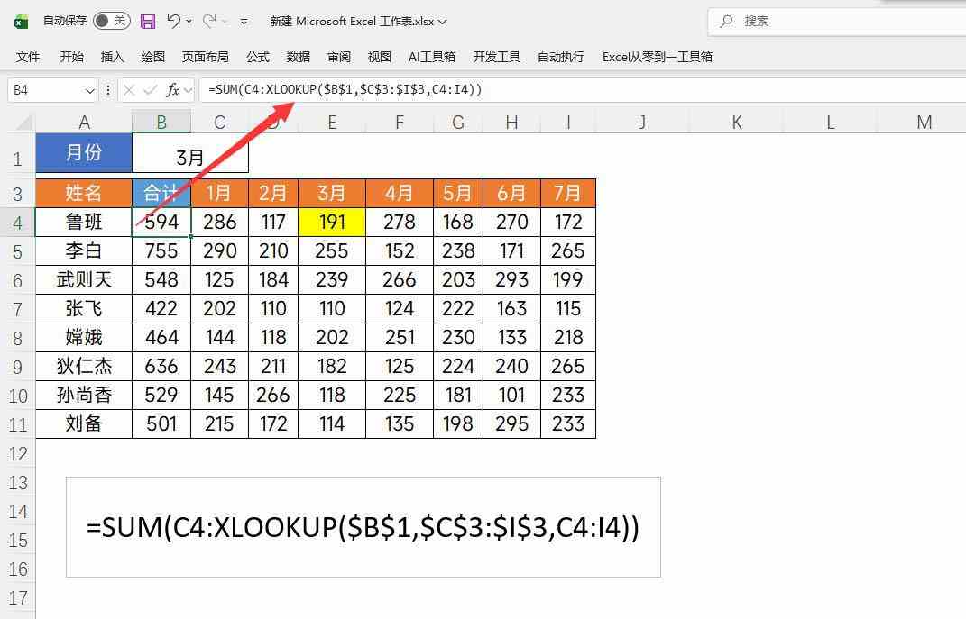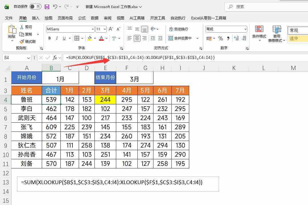 在这里C4是第一个数据的位置,也是计算的起始位置,获取了起始位置,我们在利用Xlookup查找到月份对用的位置,组成一个数据区域,这个区域就是我们的求和区域,最后利用SUM函数求和即可,效果类似于: =SUM(C4:E4)
