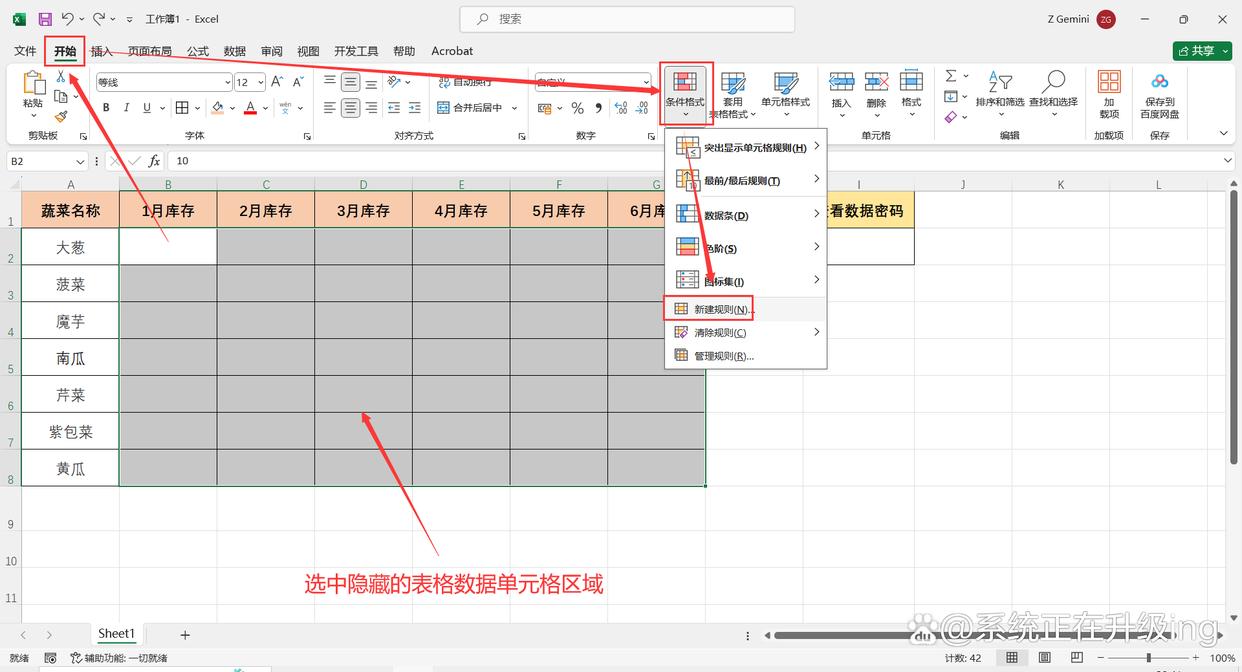 3、选中隐藏的表格数据单元格区域,点击【开始】-【条件格式】-【新建规则】,弹出“新建格式规则”对话框。