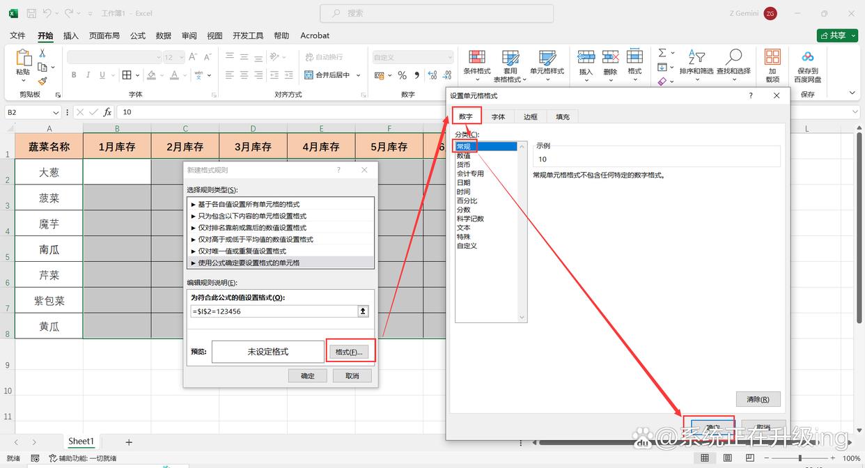 4、在“新建格式规则”对话框中,设置参数①②,然后点击【格式】,弹出“设置单元格格式”对话框。
