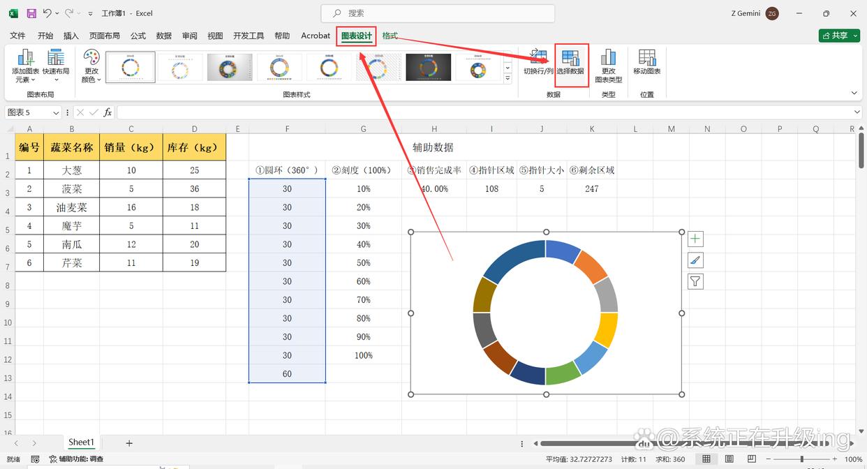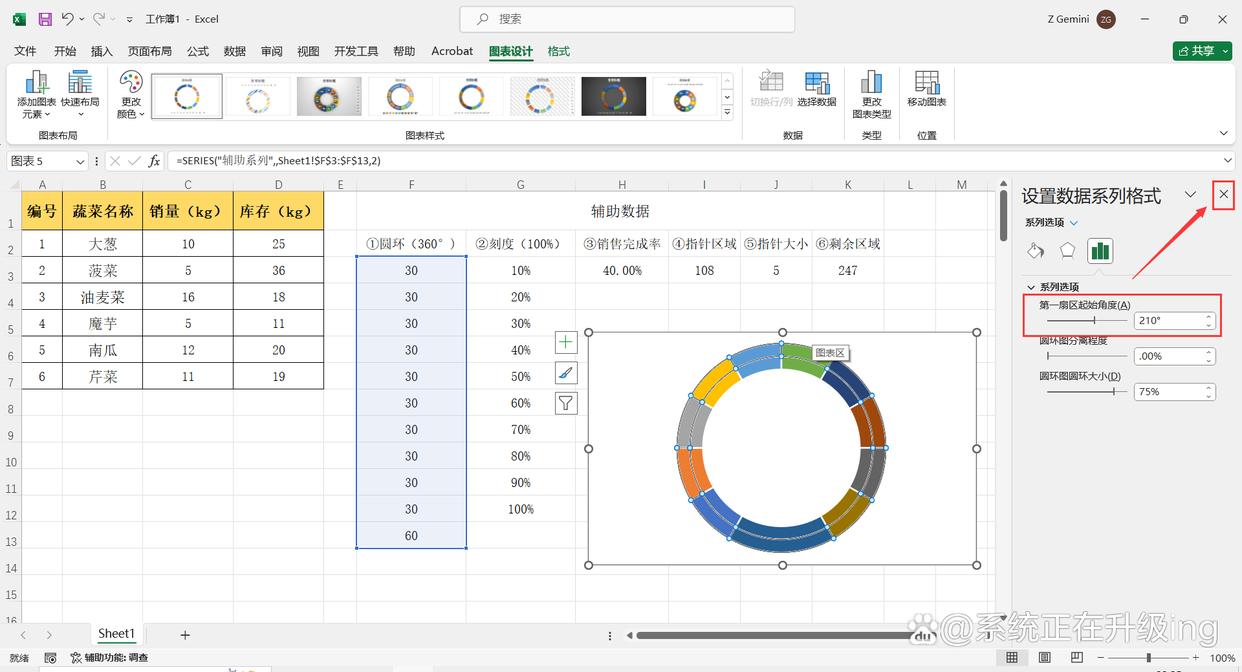 - ①圆环列数据:圆环共360°空出60°,剩下的分成10份(可根据需要自定分成份数),即:(360-60)/10=30,每份30°。