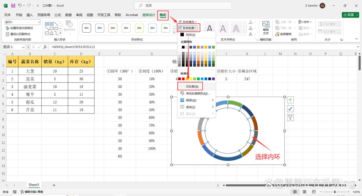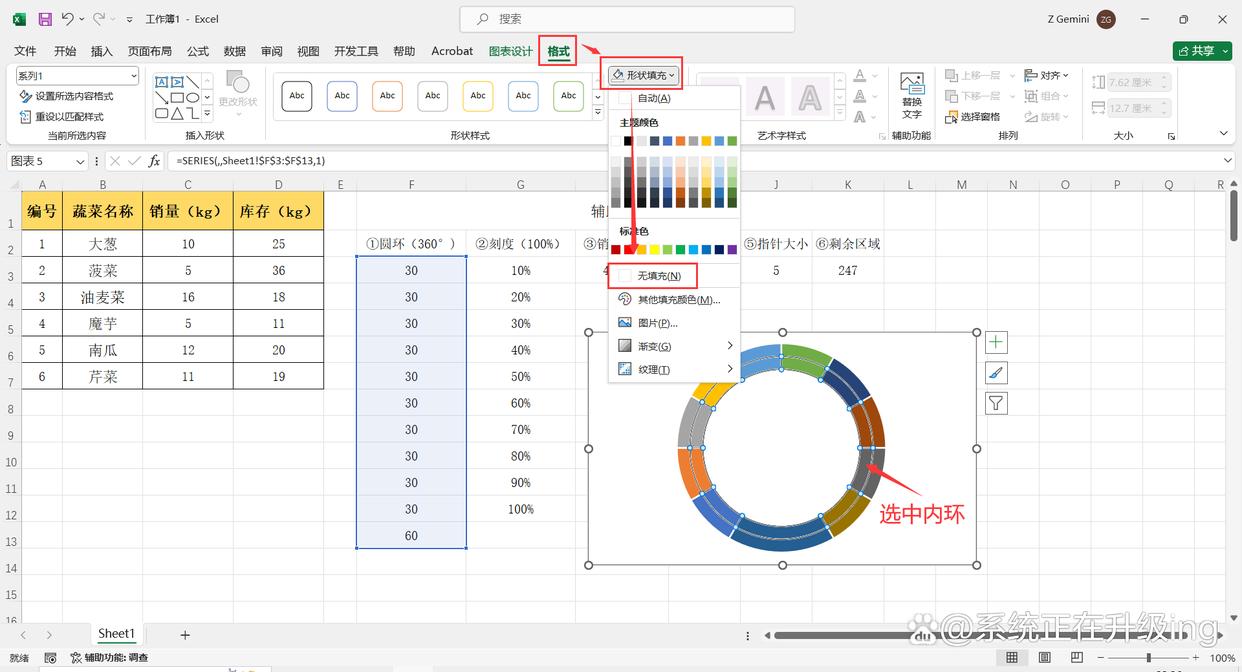 6、选中内圆环,点击【格式】选项卡,然后点击【形状填充】-【无填充】,继续点击【形状轮廓】-【无轮廓】,将内圆环取消显示。
