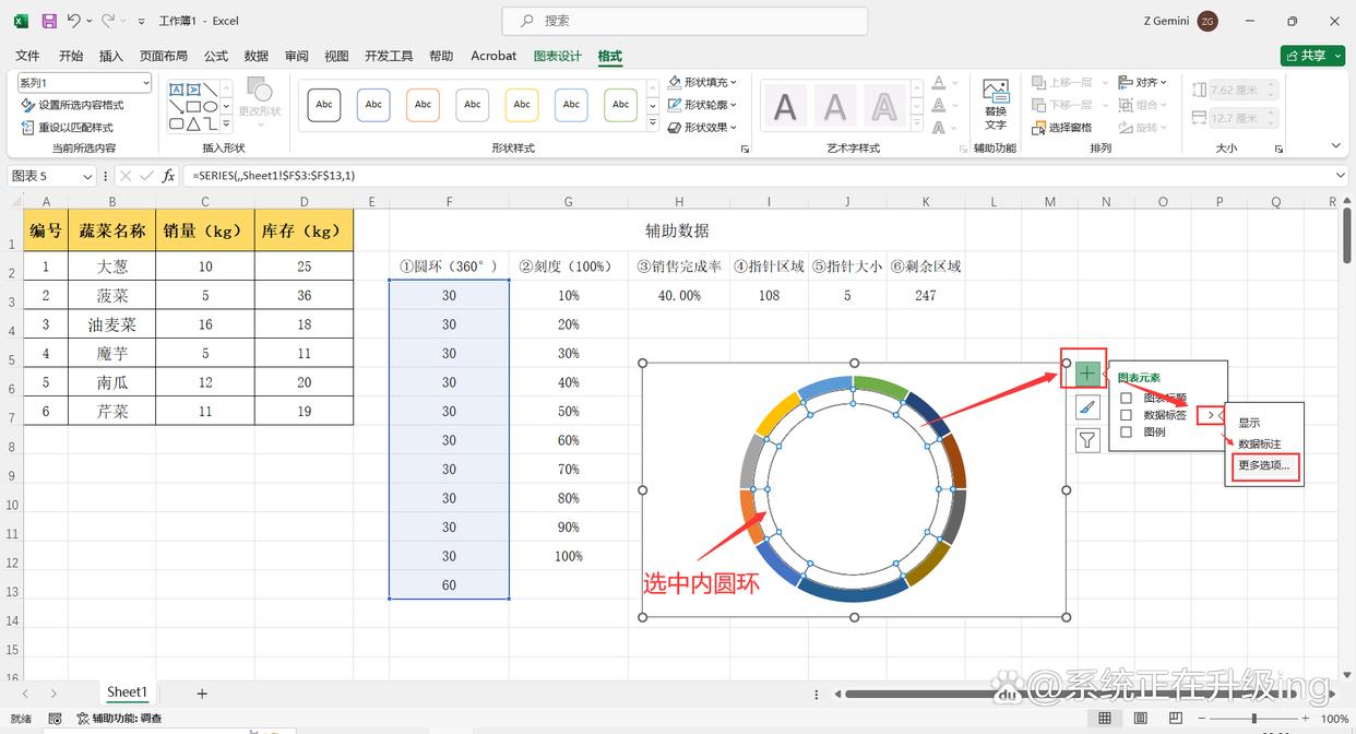 7、选中内圆环,点击图表右上方+号(图表元素),选择【数据标签】-【更多选项】,在弹出的“设置数据系列格式”对话框中,勾选【单元格中的值】,在新弹出对话框的“选取数据标签区域”中输入:=Sheet1!$G$3:$G$12(即:拾取②刻度列数据单元格区域),然后点击【确定】,再将【值】取消勾选,关闭对话框即可。