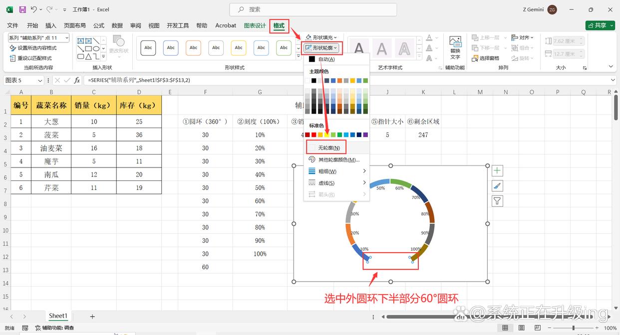 8、选中外圆环下半部分60°圆环,点击【格式】选项卡,然后点击【形状填充】-【无填充】,继续点击【形状轮廓】-【无轮廓】,将外圆环中60°圆环取消显示。
