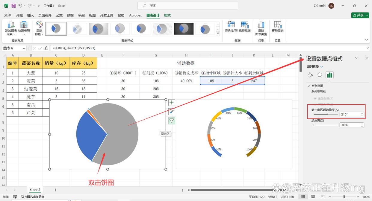 10、双击饼图,弹出“设置数据系列格式”对话框,将“系列选项”中的“第一扇区起始角度”设置为:210°,然后关闭对话框。再将饼图背景和饼图只保留指针大小5的部分,其他部分都设置为无填充,无轮廓。