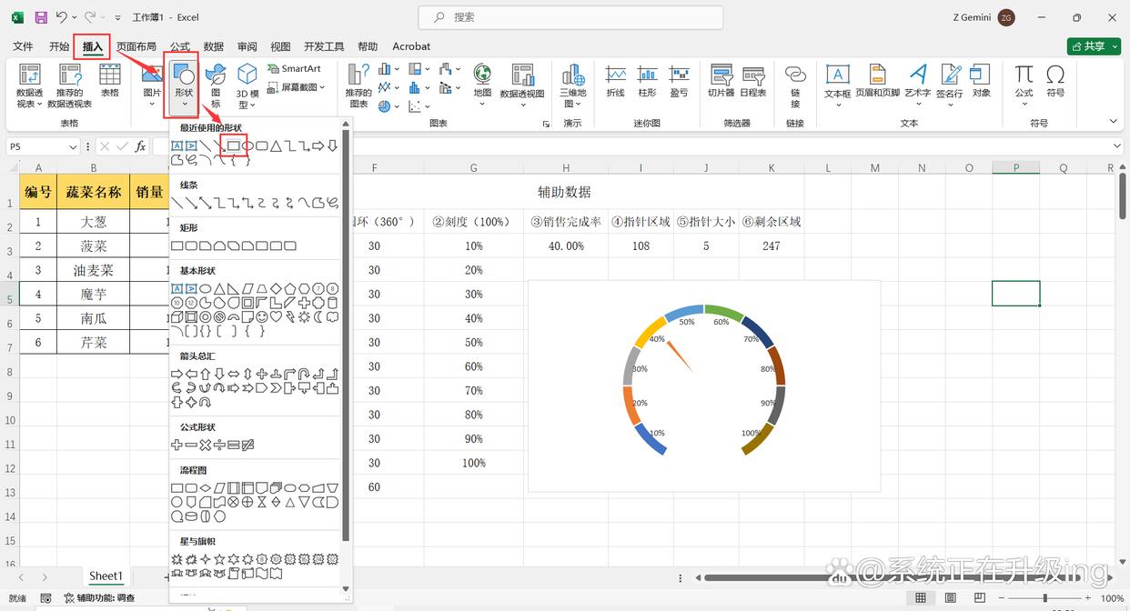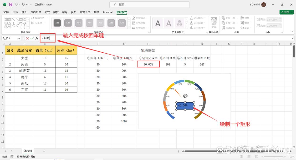 12、点击【插入】-【形状】-【矩形】,再图表中绘制一个矩形框,然后在上方编辑栏输入:=$H$3(即:③销量完成率数据单元格),输入完成按【enter】键。