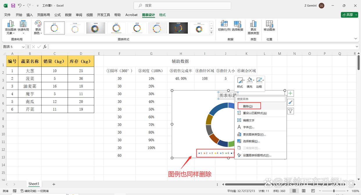 2、选中①圆环列数据单元格区域,点击【插入】-【圆环图】,在表格中插入一个圆环图,然后在圆环图中的“图表标题”和“图例”上单击鼠标右键,点击【删除】。