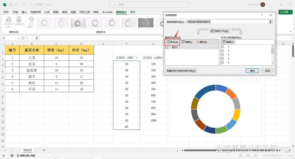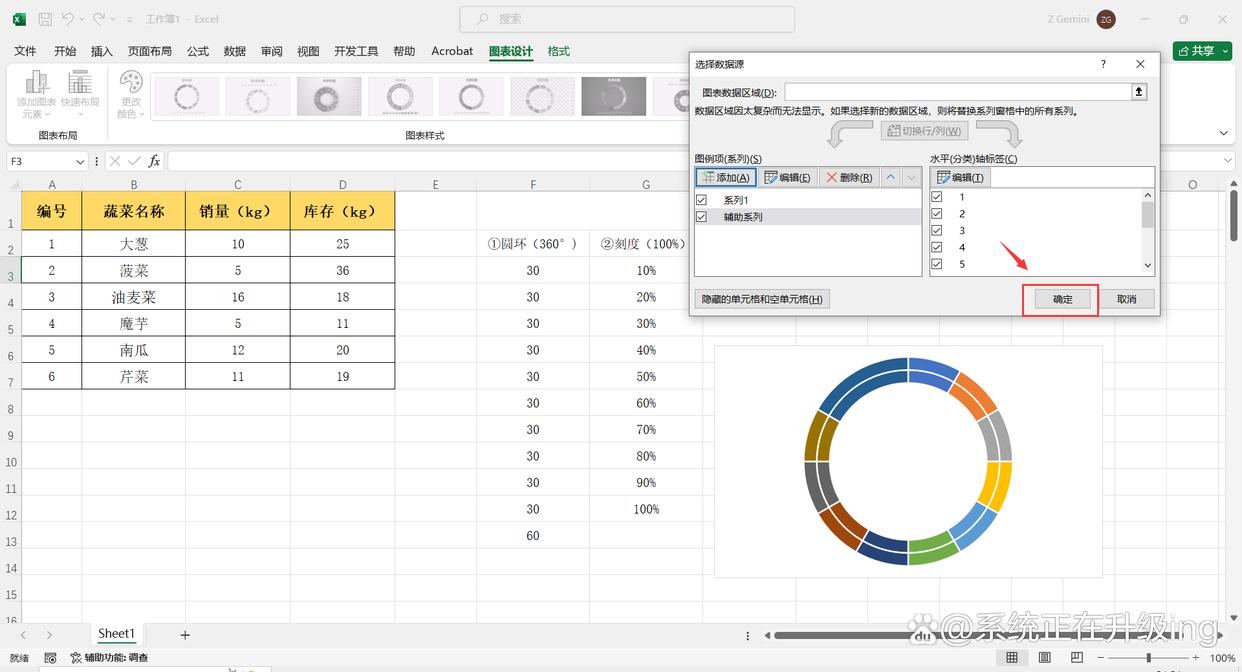 4、在“编辑数据系列”对话框中,将“系列名称”设置为:辅助系列(可自定义名称);“系列值”:=Sheet1!$F$3:$F$13(即:拾取①圆环列数据单元格区域),然后点击【确定】,返回到“选取数据源”对话框点击【确定】,这样就新添加了一个内圆环。