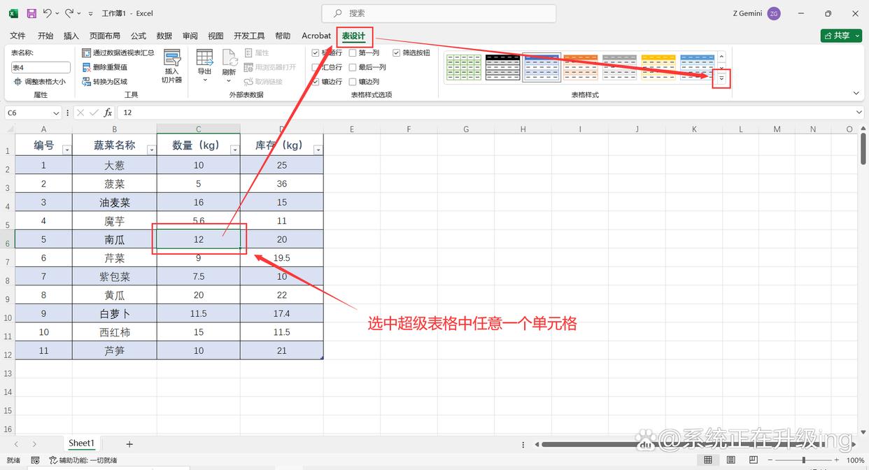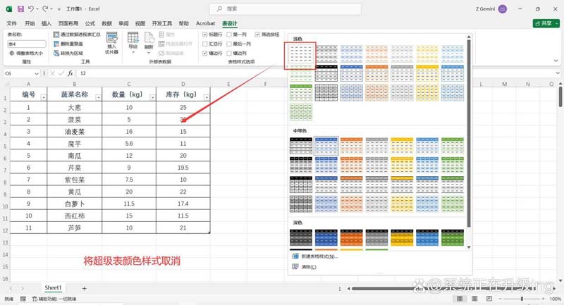 1、打开Excel表格,选中超级表格中任意一个单元格,点击【表设计】选项卡,点击“表格样式”样式栏右侧向下箭头图标按钮,在展开的菜单中选择【浅色】-【无】,将超级表颜色样式取消。