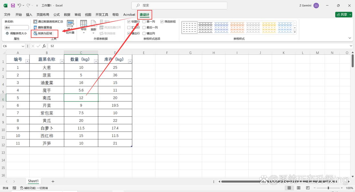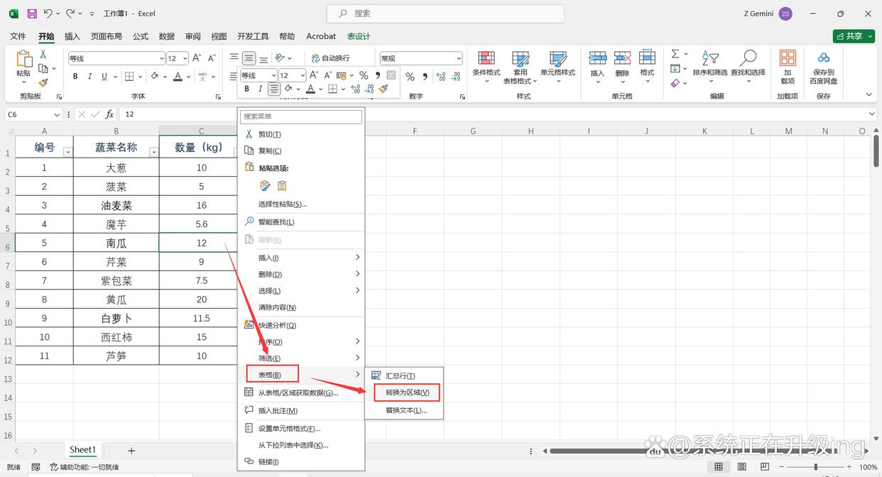 3、也可选中超级表格中任意一个单元格,单击鼠标右键,点击【表格】-【转换为区域】,然后再弹出的对话框中点击【确定】,也可取消成超级表格式。
