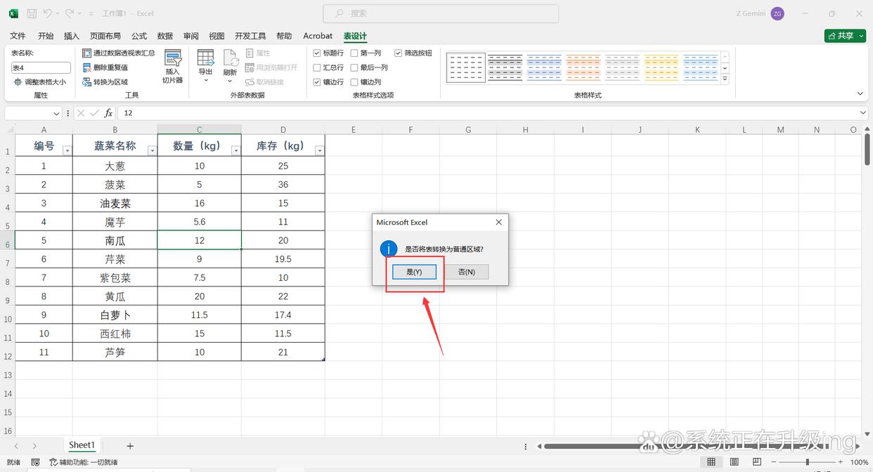 2、点击【表设计】选项卡,在“工具”栏中点击【转换为区域】,在弹出的“Microsoft Excel”对话框中点击【确定】,这样超级表格就转化为了普通表格。