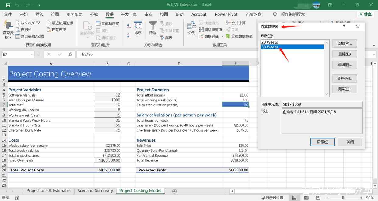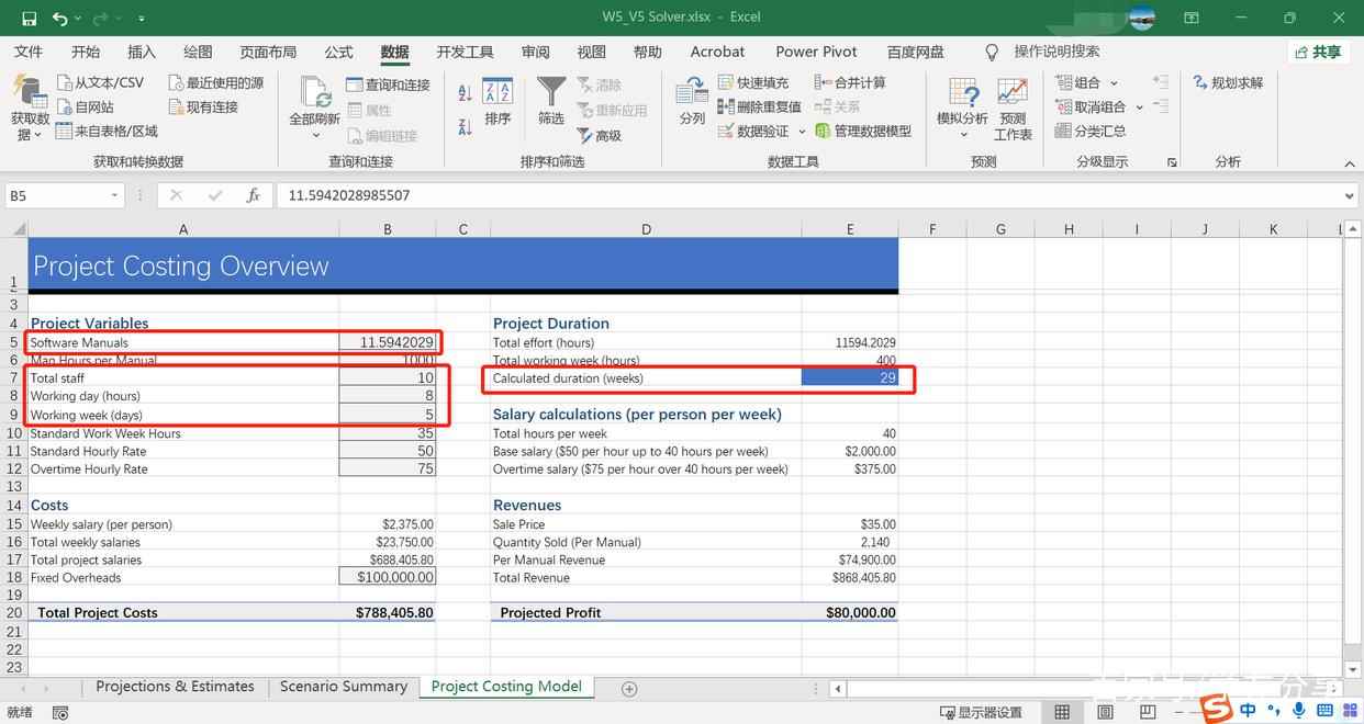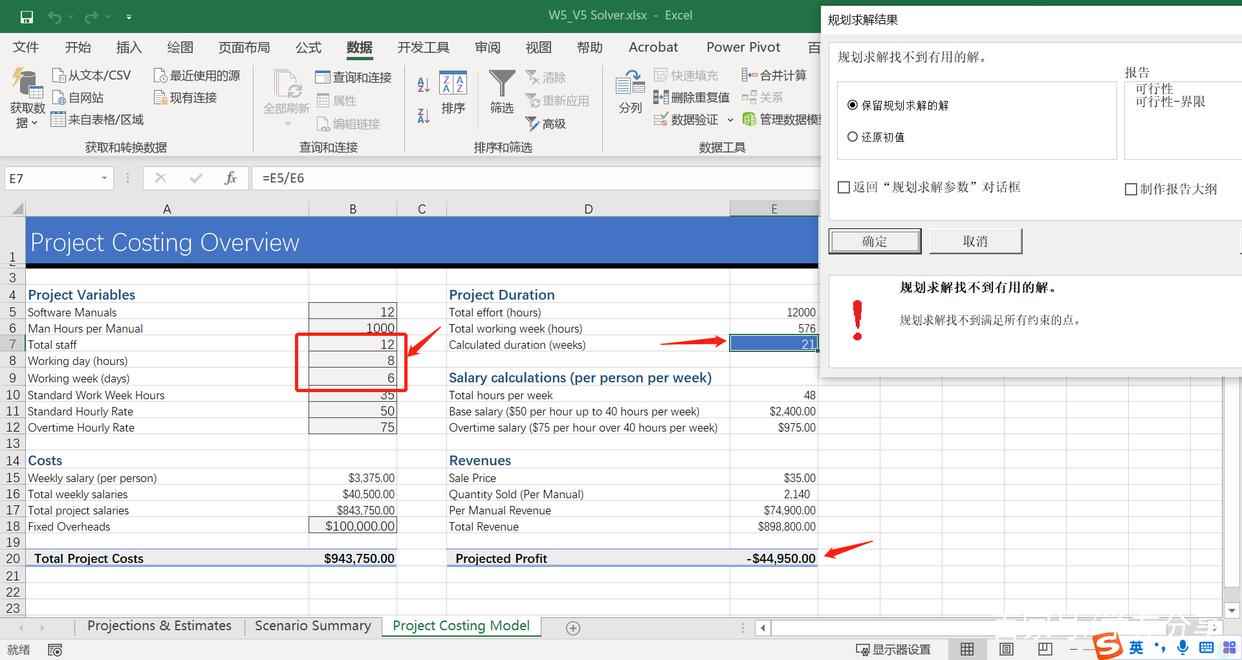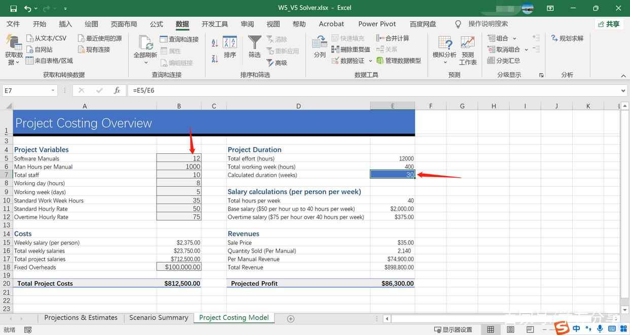 当修改B5单元格中的数据为12后,E7单元格的数据变为30,要使其变成20,我们可以尝试对B7至B9单元格中的“staff”、“Working day”和“Working week”进行修改。