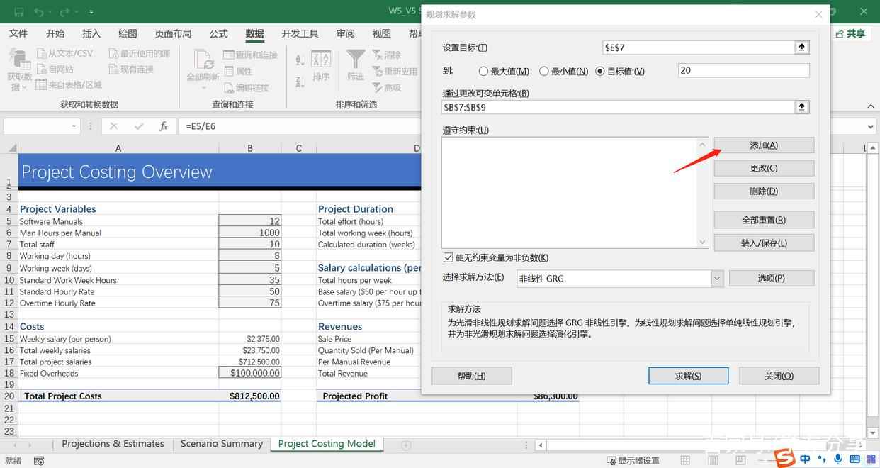 点击“规划求解”中的“添加”按钮。