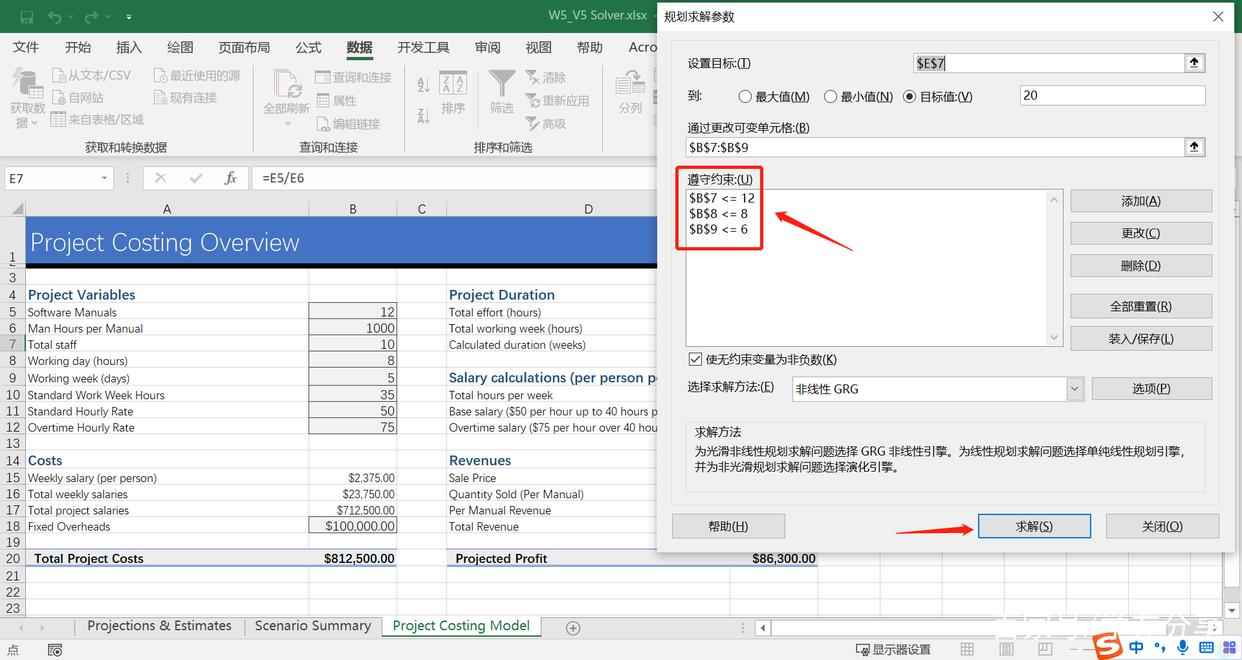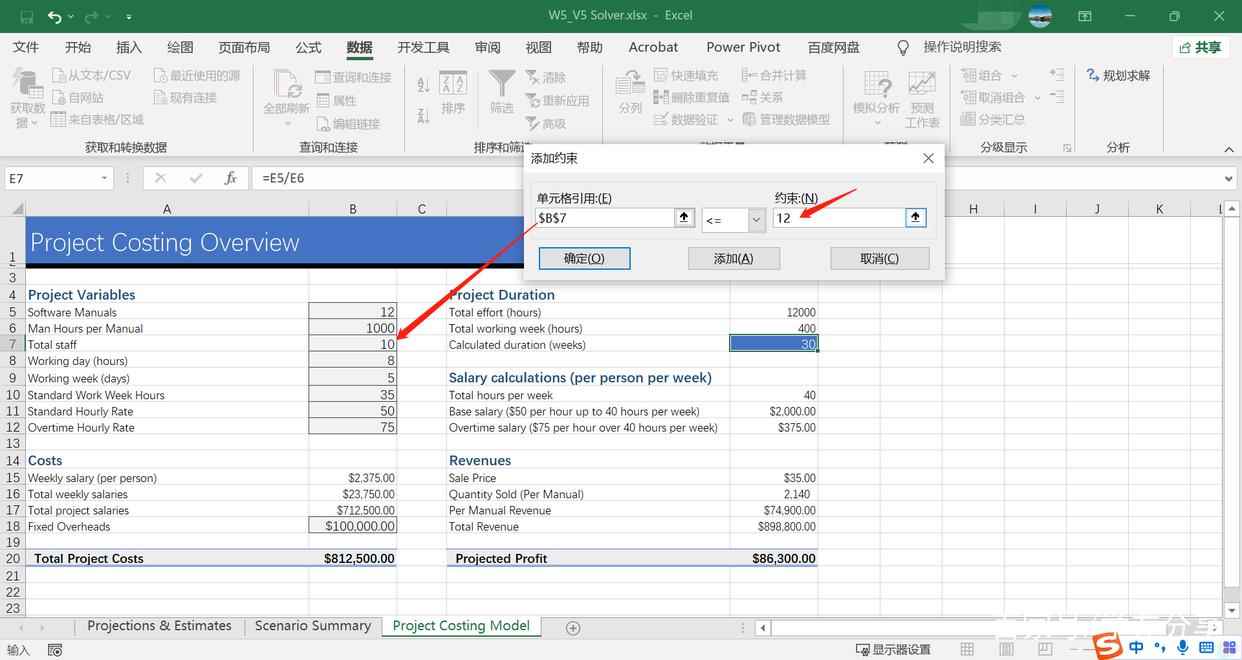 我们继续通过“规划求解”来找到更加合适的方案,但这次我们有一些对变量的约束,即“staff”不超过12,“Working day”不超过8,“Working week”不超过6。