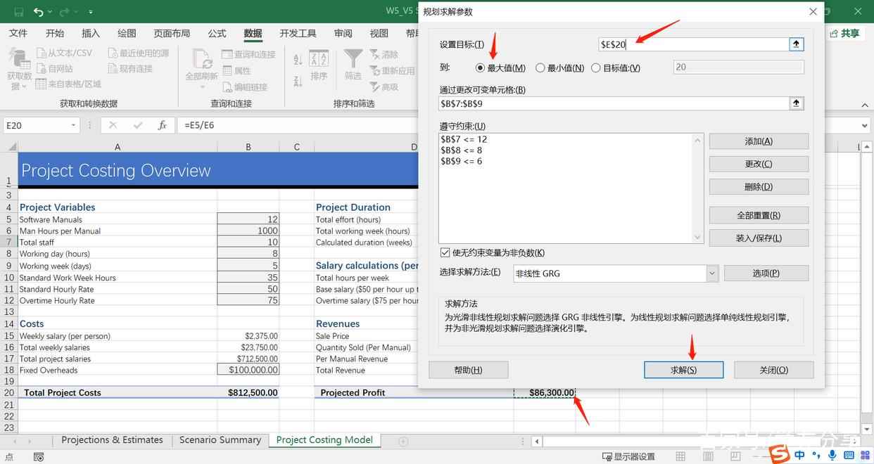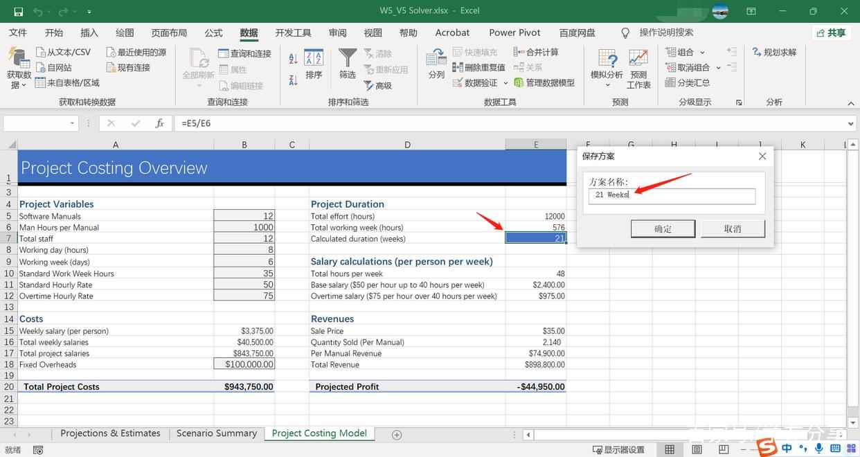 所期望的需求是:当B5单元格中的“Manuals”为12,并且E7单元格的“duration”为20时,是否E20单元格中的“Profit”仍能达到一个比较理想的结果。